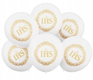Balony IHS KOMUNIA święta zestaw 6szt. biało-złote dekoracje na komunię