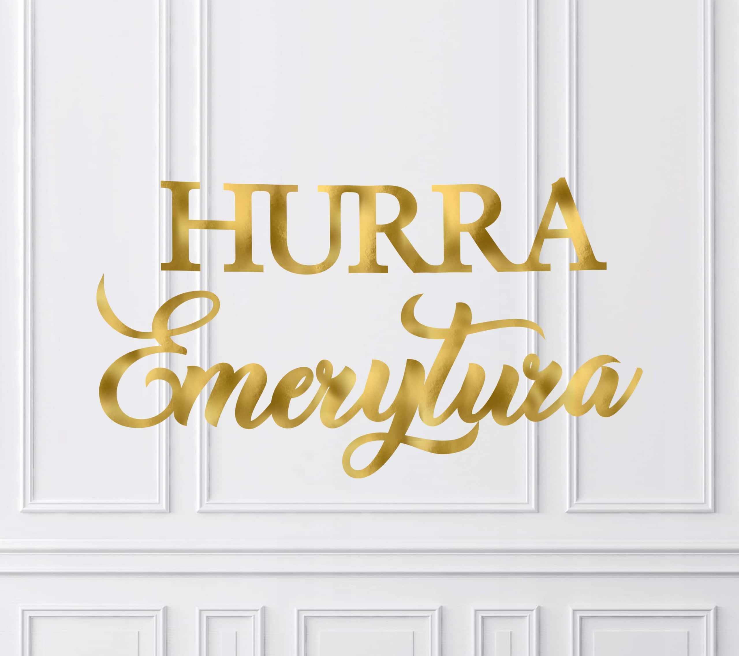 • Wymiary: Napis „HURRA” o szerokości 48 cm oraz „EMERYTURA” o szerokości 50 cm, idealne do wyeksponowania.