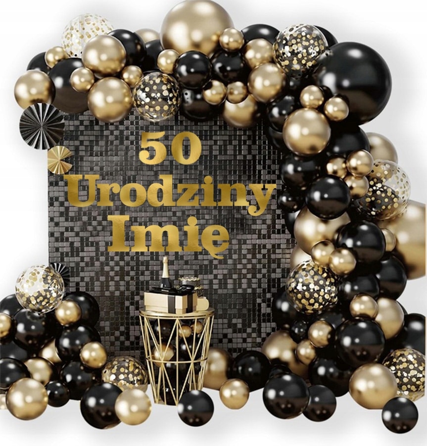 Zestaw zawiera baner Urodziny + imię, balony lateksowe złoty chrom 12,5 cm i 30 cm, balony transparentne z konfetti 30 cm, czarne balony 12,5 cm i 25 cm oraz taśmę do girlandy. Dzięki różnym rozmiarom balonów łatwo zbudować pełną, trójwymiarową girlandę na 50 urodziny.