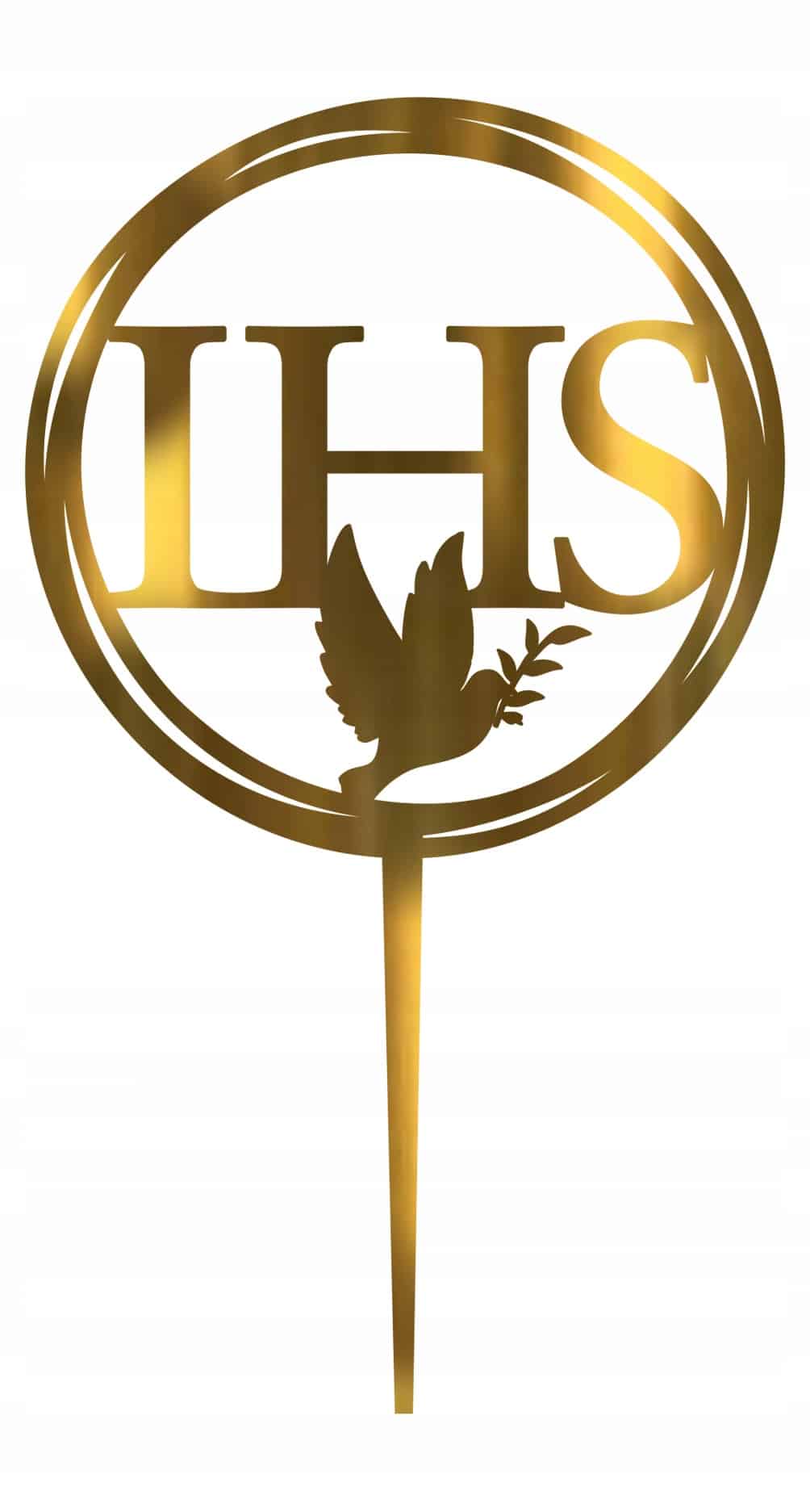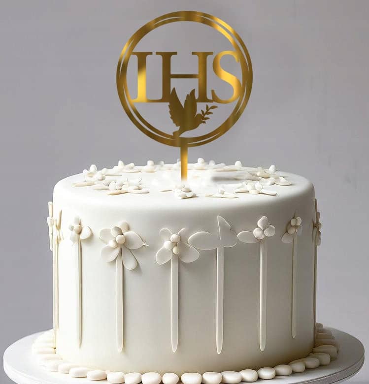 Okrągły symbol IHS ma średnicę około 10 cm, co sprawia, że idealnie sprawdza się jako centralna dekoracja na szczycie tortu.