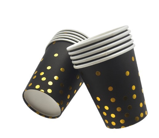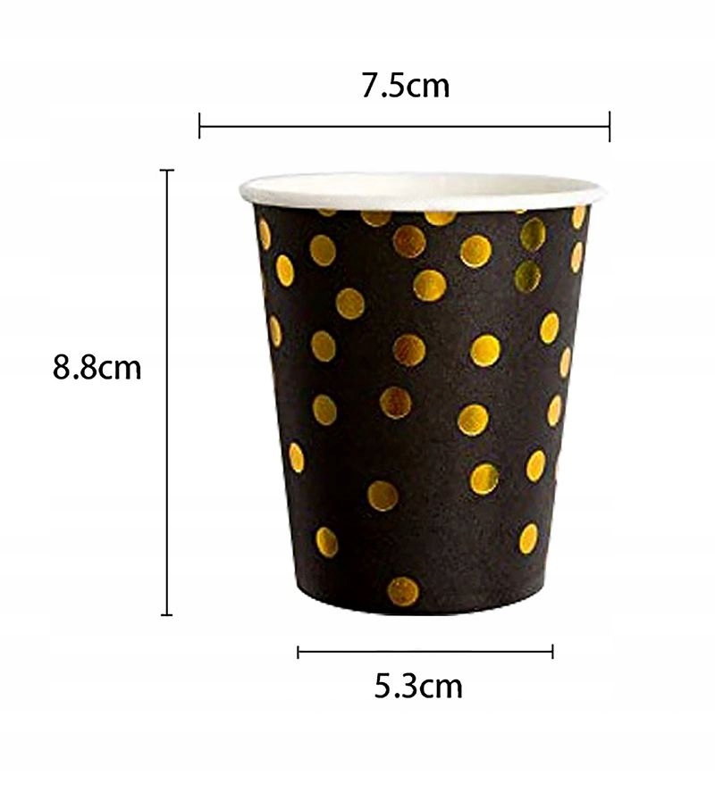 Dodaj wyjątkowego stylu swojemu przyjęciu z naszymi czarnymi kubeczkami ozdobionymi złotymi kropkami! Idealne na wesela, urodziny, baby shower i inne specjalne okazje.