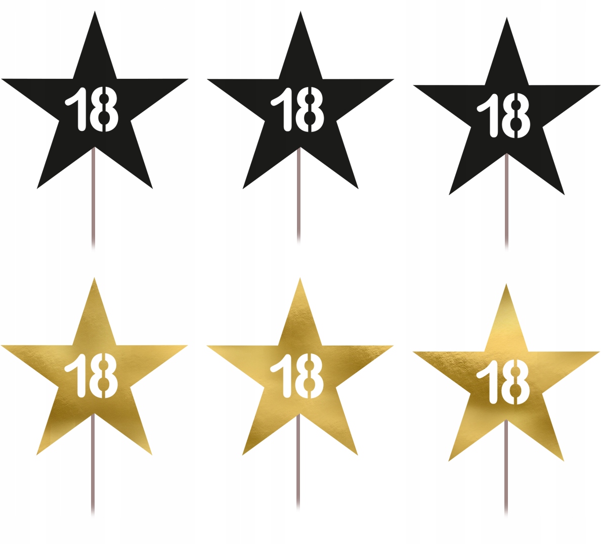 Piki pikery gwiazdki gwiazdy złote czarne 18 urodziny 6szt Dekoracje topper