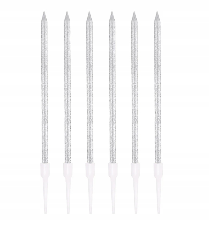 Świeczki brokatowe urodzinowe długie SREBRNE 6 szt na tort świeczki tortowe