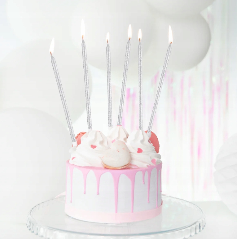 Nasze długie, srebrne świeczki urodzinowe z brokatowym wykończeniem to doskonały wybór na wyjątkowe okazje.