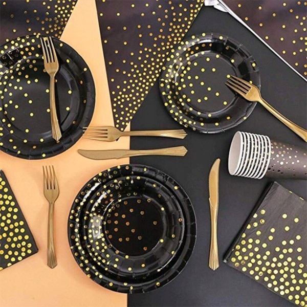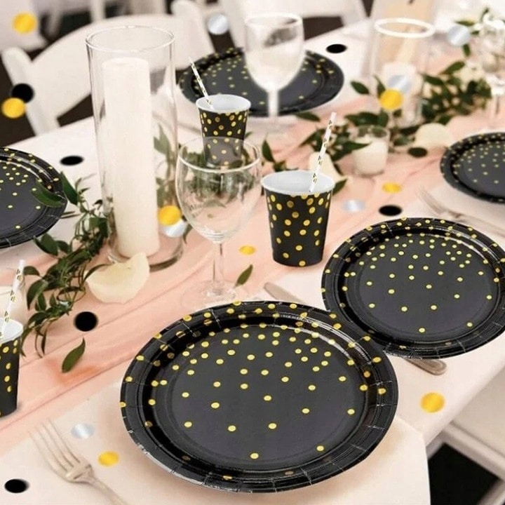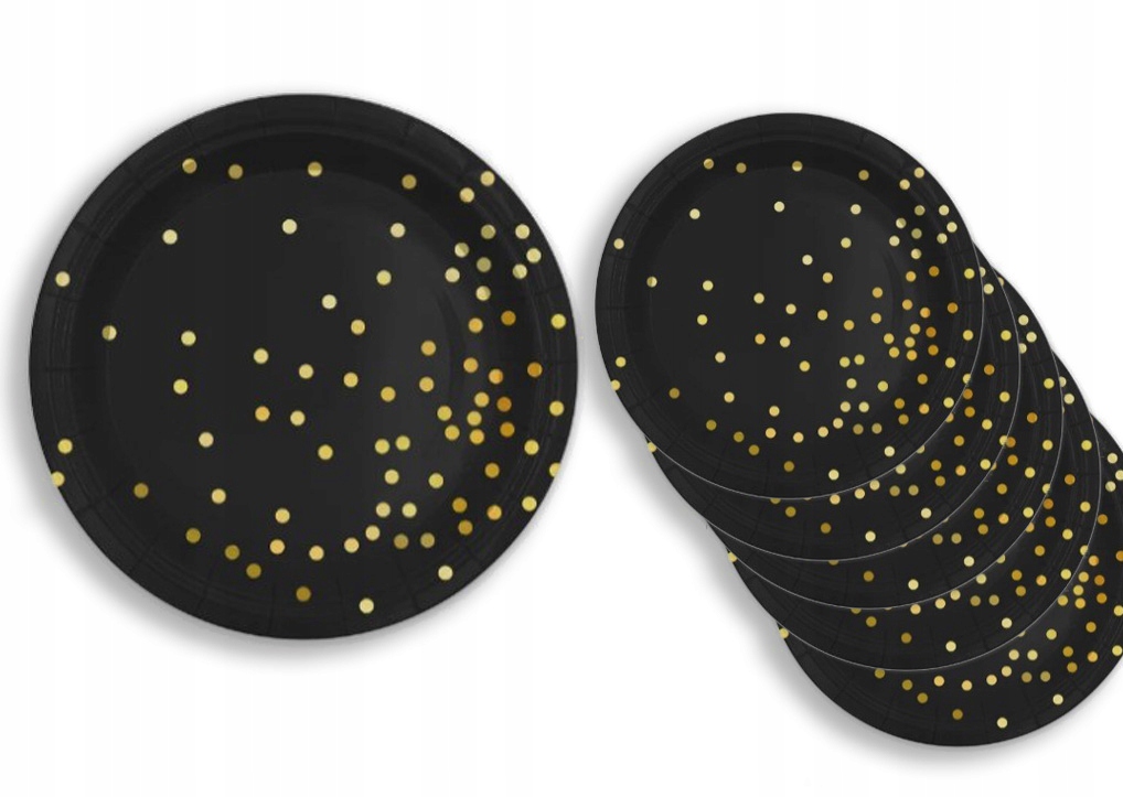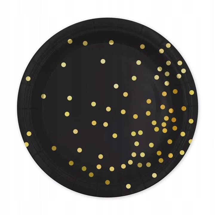 Dodaj stylu i elegancji swojemu przyjęciu z naszymi czarnymi talerzykami ozdobionymi złotymi kropkami! Idealne na wesela, urodziny, i inne wyjątkowe okazje.