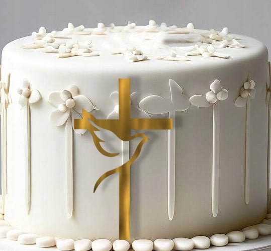 Topper na bok toru krzyż z gołębiem ZŁOTE LUSTRO plexi dekoracje na tortNa stanie: 9592 w magazynie