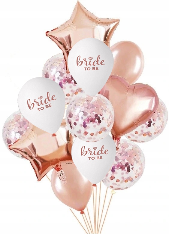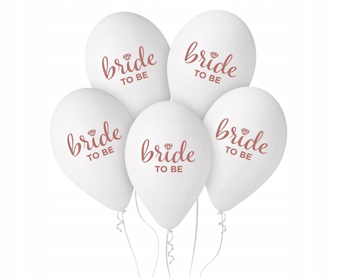 - 6 balonów w kolorze rose gold, w tym 3 z napisem „BRIDE TO BE”