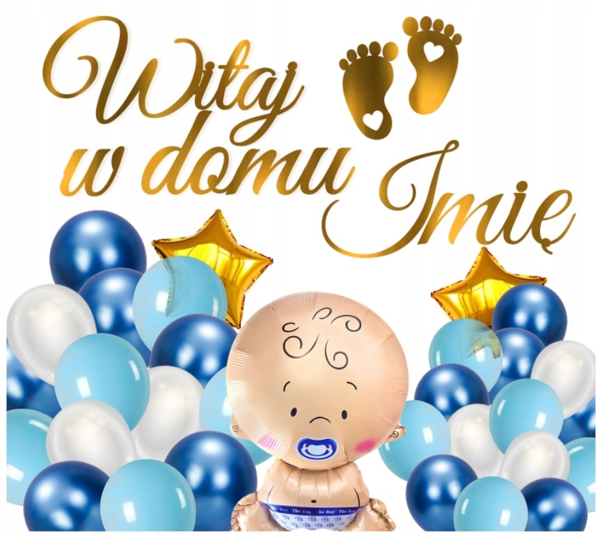 Zestaw baner WITAJ W DOMU imię balony narodziny chłopiec powitanie dziecka
