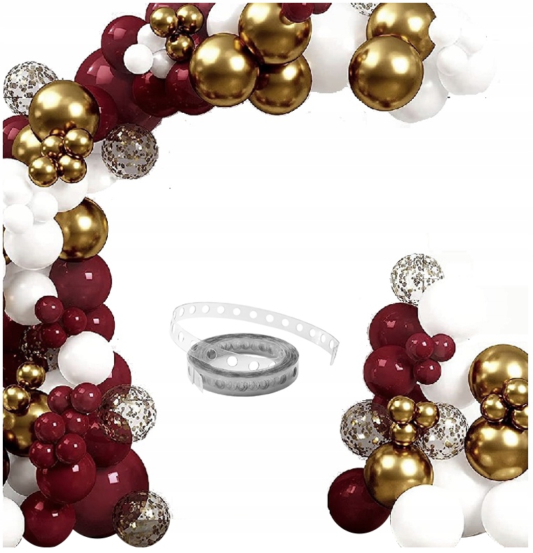 Proces przygotowania polega na napompowaniu balonów, umieszczeniu ich w otworach taśmy i zagęszczeniu konstrukcji kropkami klejowymi. Zestaw zawiera 100 sztuk balonów bordowych, 10 sztuk złotych chrome oraz 10 sztuk białych.